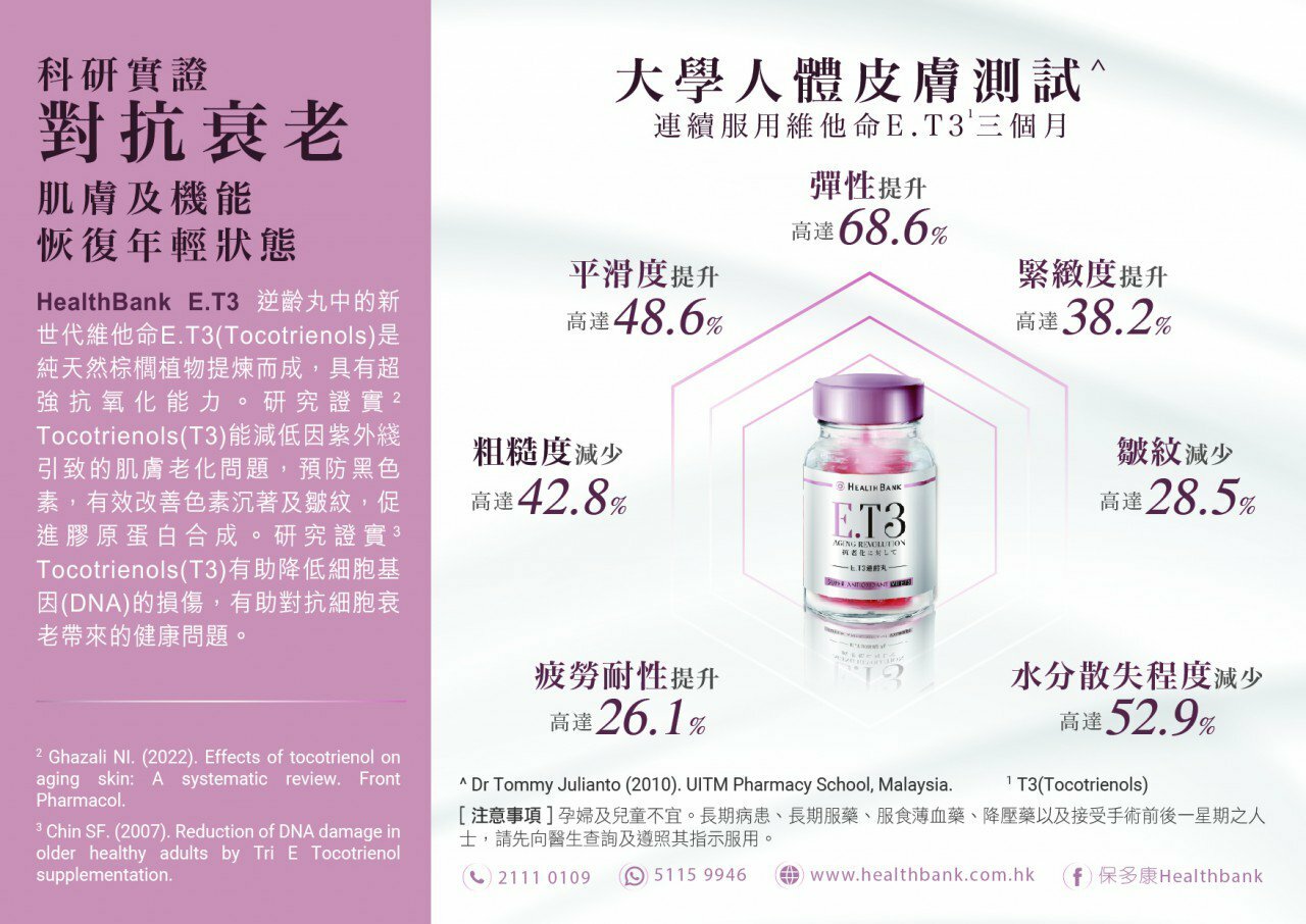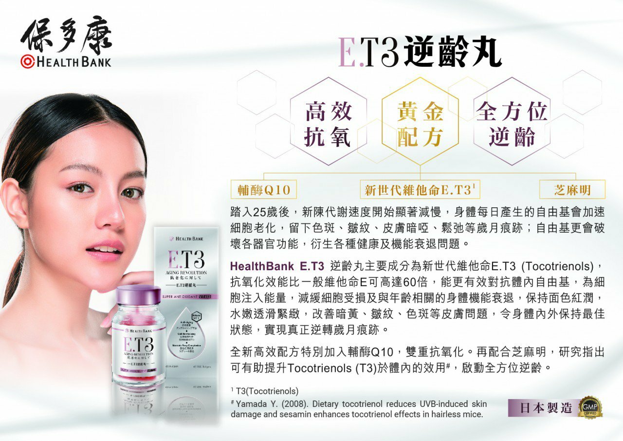 第二代E.T3逆齡丸除了原有的維他命E.T3 (Tocotrienol)外,更加入輔酶Q10,加強抗氧化效果;另外配方加入芝麻明,研究證實可加強E.T3在體內的保健作用;再加入DPA (二十二碳五烯酸),以加強對心血管的保健功效。