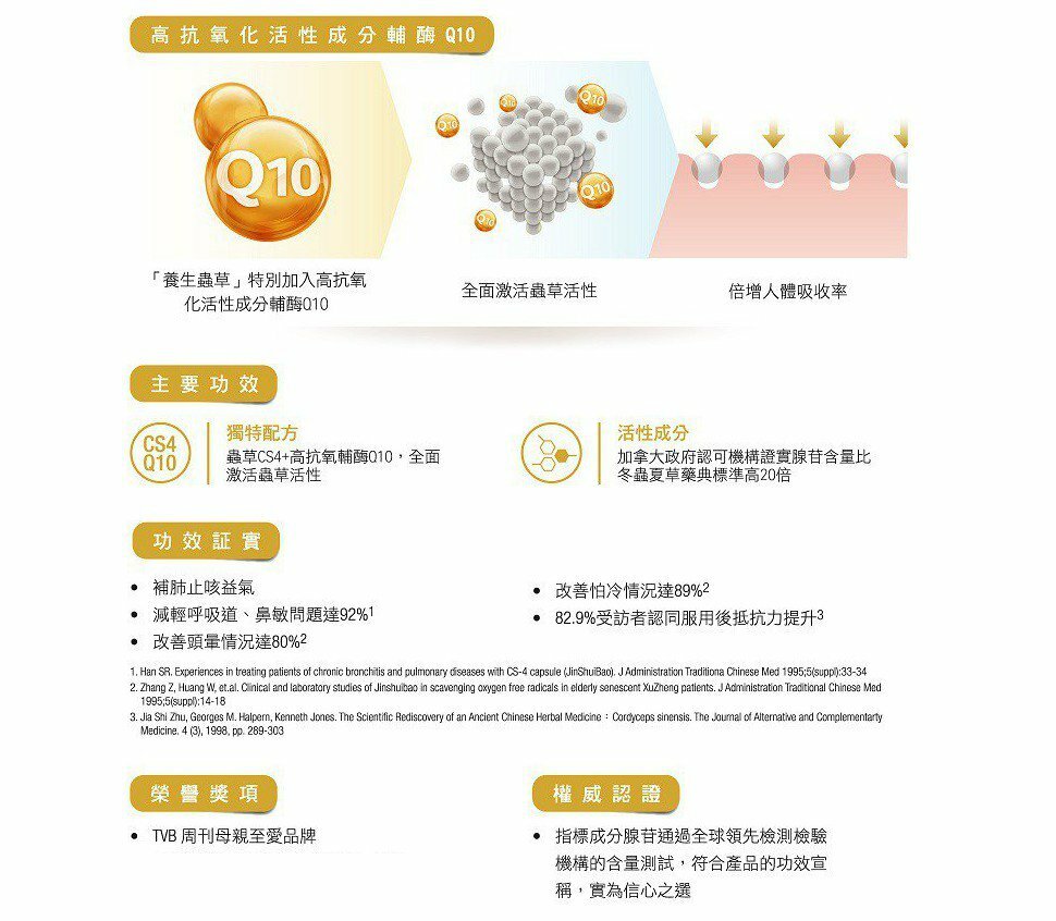 輔酶Q10 - 輔酶Q10是人體必要的元素,具有很高的抗氧能力,能清除自由基,更能與其他抗氧化物質 (如維他命E) 產生協同作用,減少機體組織的氧化損傷;全面激活蟲草的活性成分,有助增加人體吸收率,令功效昇華