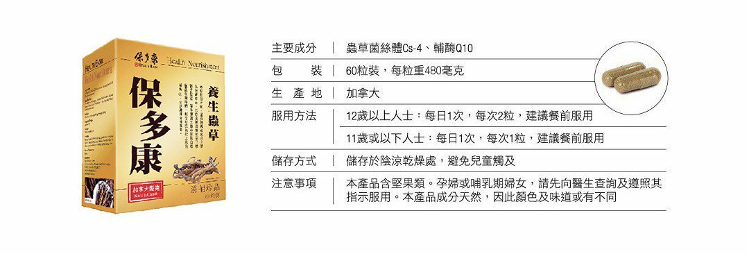 蟲草有「百藥之王」之稱,性甘平和,是補肺益腎的滋補珍品。用於精氣不足、久咳虛喘、精神疲憊、睡眠不佳;是氣虛體弱、手腳冰冷、血氣不足人士之養生聖首。保多康「養生蟲草」採用一級上等蟲草菌絲體Cs-4,蘊含豐富的活性成分,獲得加拿大政府認可機構證實有效成分腺苷含量比冬蟲夏草國家標準高20倍。「養生蟲草」特別加入高抗氧化活性成分輔酶Q10,全面激活蟲草活性,倍增人體吸收率。