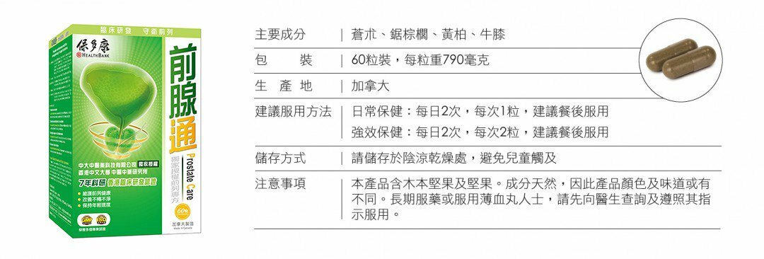 「前腺通」為香港中文大學中醫藥科技有限公司獨家授權的臨床配方,歷經七年科學研究,證實可維護前列健康及改善相關問題。「前腺通」融合中西天然草本精華,中西兩者相互融合,各揮所長,真正保持前列健康,令你日日精神爽利,充滿活力。本產品為加拿大GMP廠房精心製造,生產技術獲國際認可,並符合香港政府認可的安全標準,絕對是信心保證。配方天然,適合長期服用,實為守衛男士第一腺的首選。